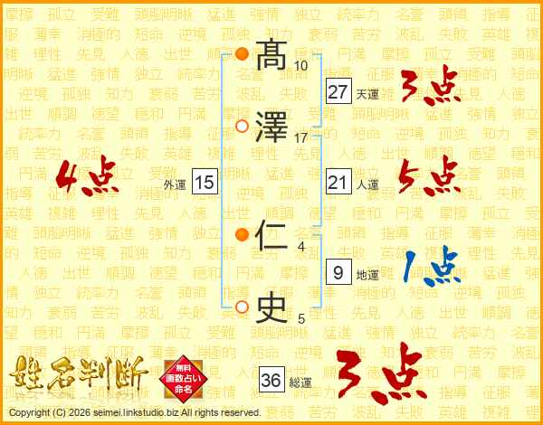 髙(10画)澤(17画) 仁(4画)史(5画)