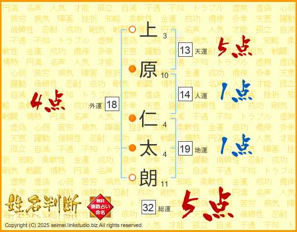 上(3画)原(10画) 仁(4画)太(4画)朗(11画)
