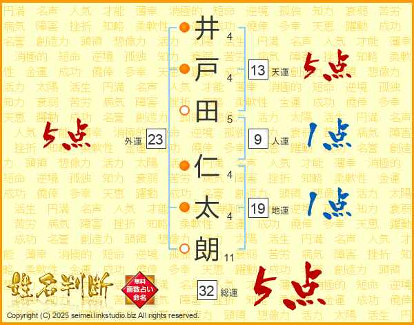 井(4画)戸(4画)田(5画) 仁(4画)太(4画)朗(11画)