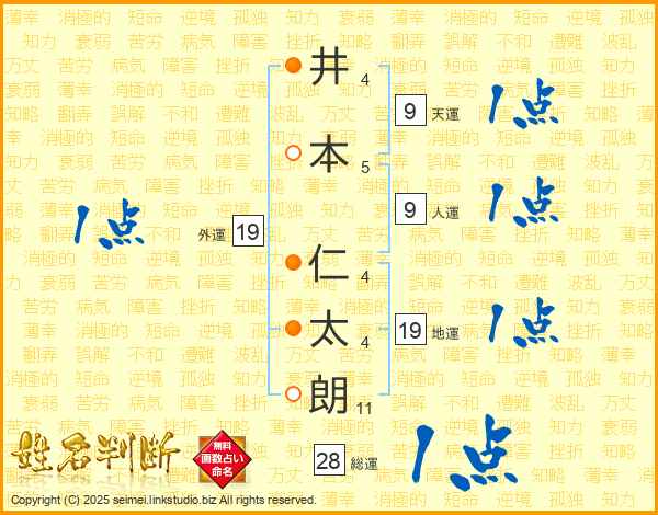 井(4画)本(5画) 仁(4画)太(4画)朗(11画)