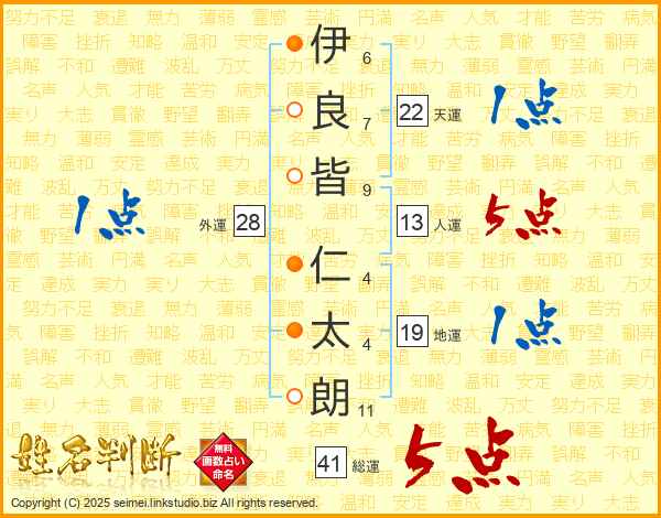 伊(6画)良(7画)皆(9画) 仁(4画)太(4画)朗(11画)