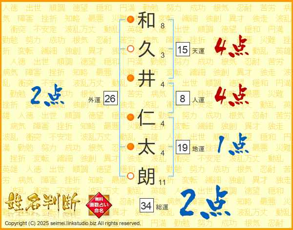 和(8画)久(3画)井(4画) 仁(4画)太(4画)朗(11画)