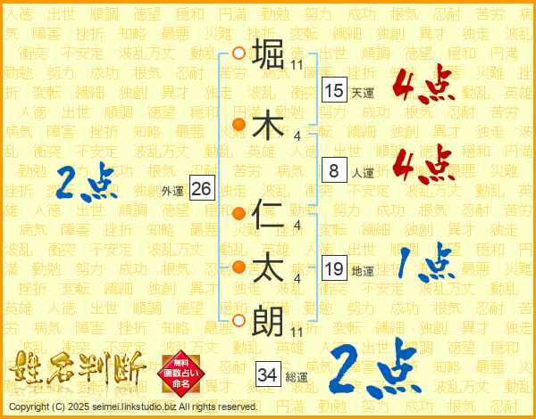 堀(11画)木(4画) 仁(4画)太(4画)朗(11画)