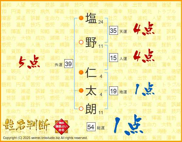 塩(24画)野(11画) 仁(4画)太(4画)朗(11画)