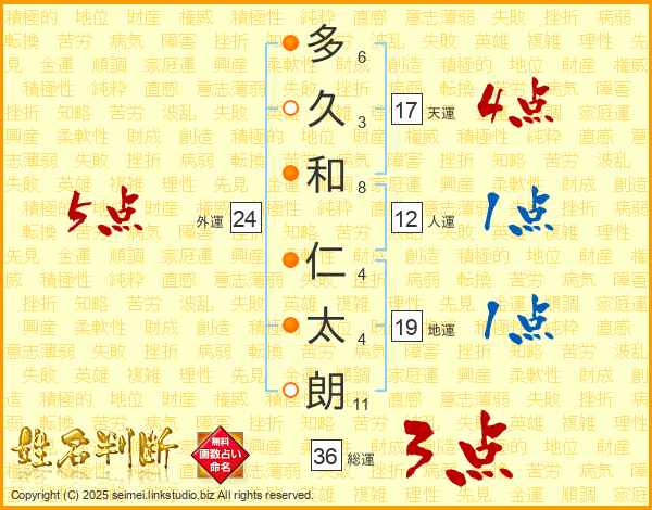 多(6画)久(3画)和(8画) 仁(4画)太(4画)朗(11画)