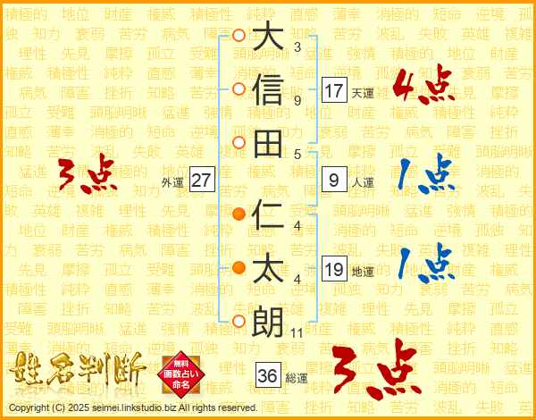 大(3画)信(9画)田(5画) 仁(4画)太(4画)朗(11画)