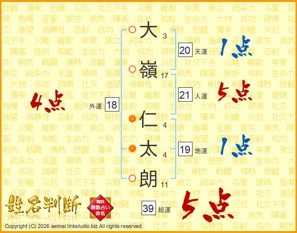 大(3画)嶺(17画) 仁(4画)太(4画)朗(11画)