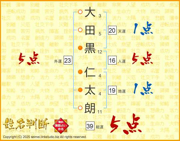 大(3画)田(5画)黒(12画) 仁(4画)太(4画)朗(11画)
