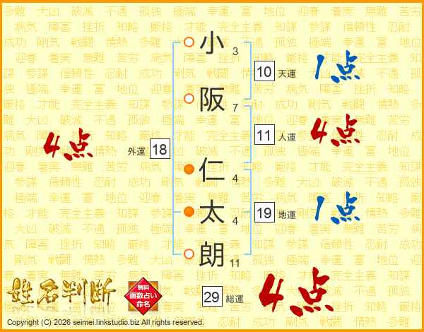 小(3画)阪(7画) 仁(4画)太(4画)朗(11画)