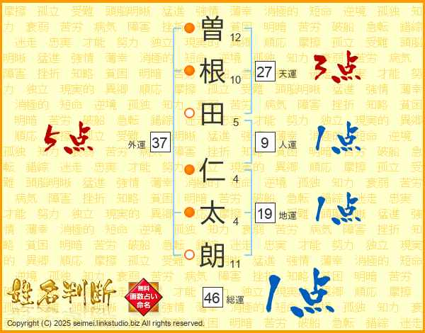 曽(12画)根(10画)田(5画) 仁(4画)太(4画)朗(11画)