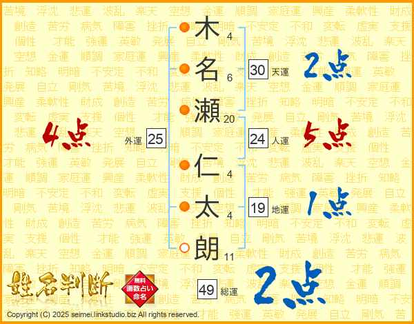 木(4画)名(6画)瀬(20画) 仁(4画)太(4画)朗(11画)