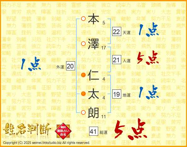 本(5画)澤(17画) 仁(4画)太(4画)朗(11画)