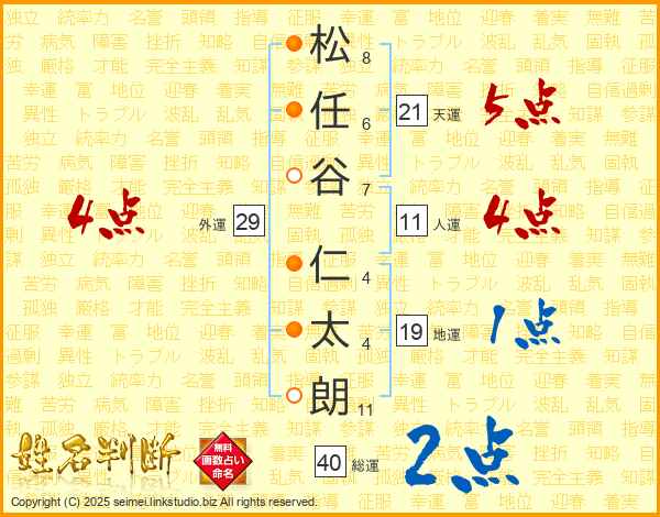 松(8画)任(6画)谷(7画) 仁(4画)太(4画)朗(11画)
