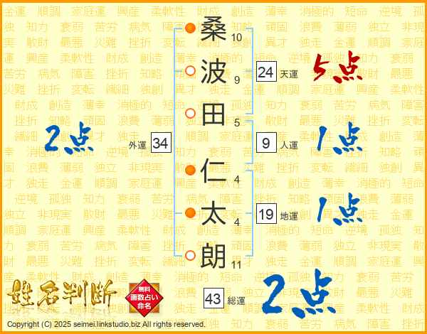 桑(10画)波(9画)田(5画) 仁(4画)太(4画)朗(11画)