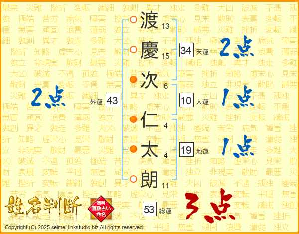 渡(13画)慶(15画)次(6画) 仁(4画)太(4画)朗(11画)