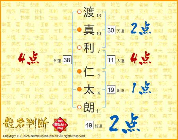 渡(13画)真(10画)利(7画) 仁(4画)太(4画)朗(11画)