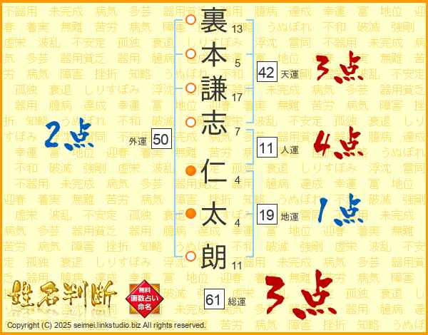 裏(13画)本(5画)謙(17画)志(7画) 仁(4画)太(4画)朗(11画)