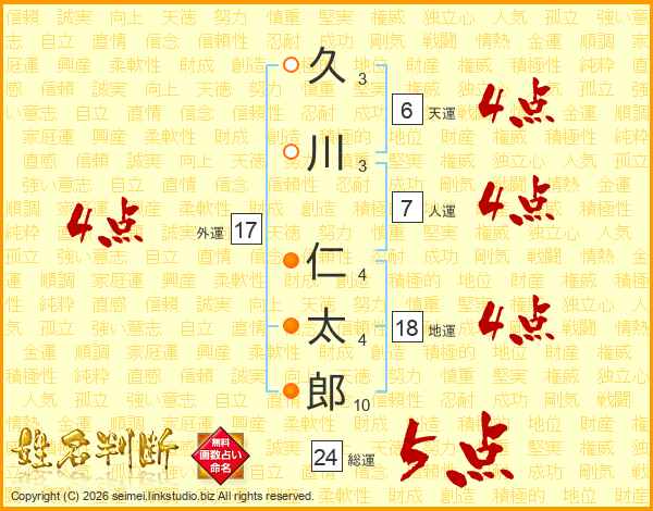 久(3画)川(3画) 仁(4画)太(4画)郎(10画)