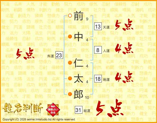 前(9画)中(4画) 仁(4画)太(4画)郎(10画)