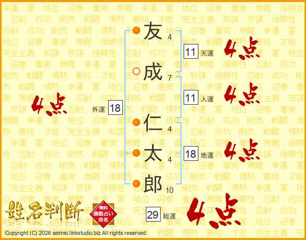 友(4画)成(7画) 仁(4画)太(4画)郎(10画)