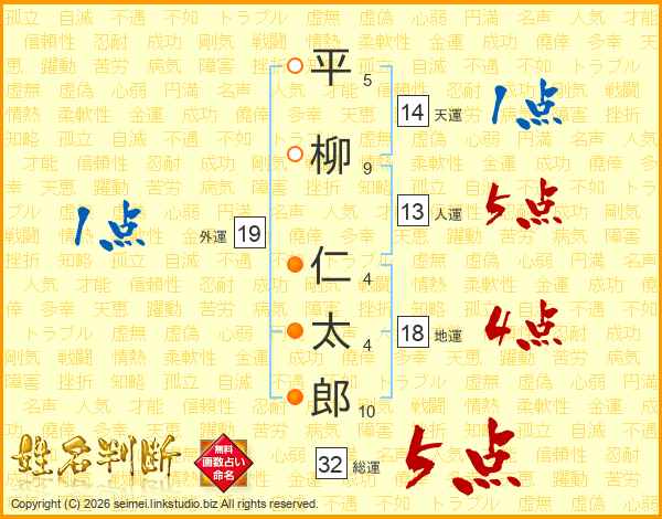 平(5画)柳(9画) 仁(4画)太(4画)郎(10画)