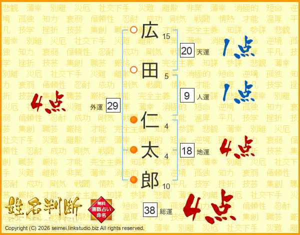 広(15画)田(5画) 仁(4画)太(4画)郎(10画)