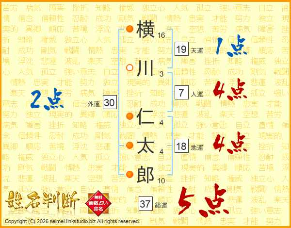 横(16画)川(3画) 仁(4画)太(4画)郎(10画)