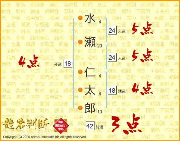 水(4画)瀬(20画) 仁(4画)太(4画)郎(10画)