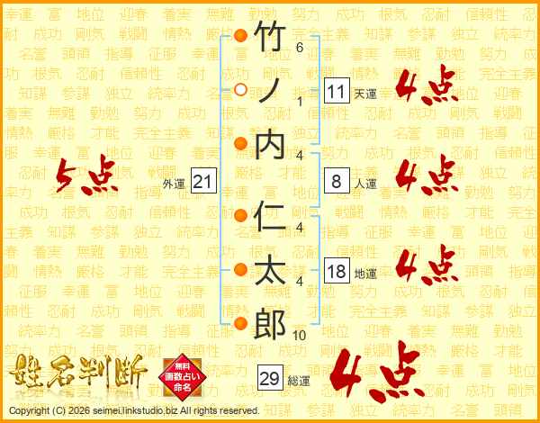 竹ノ内仁太郎さんの総運は29画の4点!