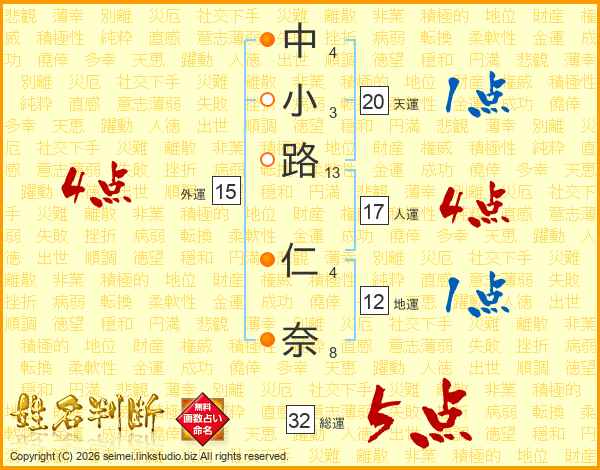 中(4画)小(3画)路(13画) 仁(4画)奈(8画)
