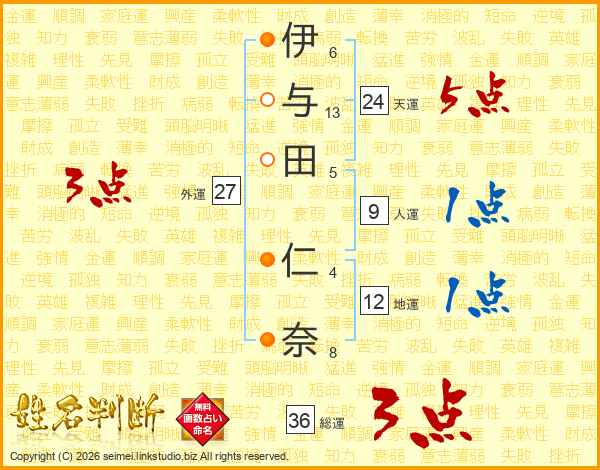 伊与田仁奈さんの総運は36画の3点!