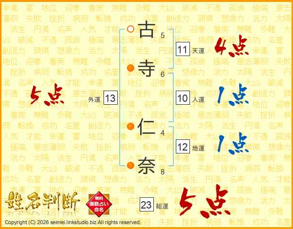 古(5画)寺(6画) 仁(4画)奈(8画)