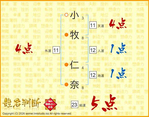 小(3画)牧(8画) 仁(4画)奈(8画)