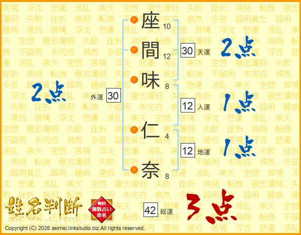 座(10画)間(12画)味(8画) 仁(4画)奈(8画)