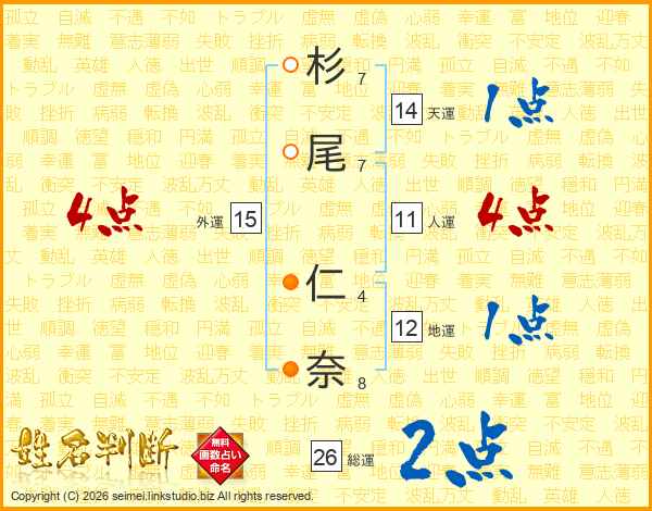 杉(7画)尾(7画) 仁(4画)奈(8画)
