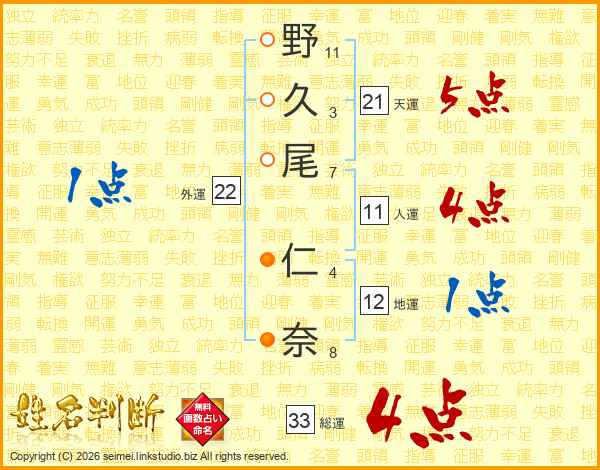 野(11画)久(3画)尾(7画) 仁(4画)奈(8画)