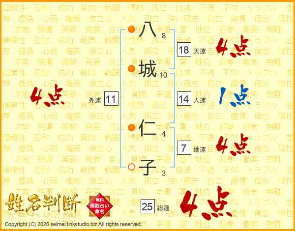 生活面を象徴する運勢です。外部から受ける影響力を表し、結婚運、家庭運や職場、環境への順応性を表します。総運から人運を引いた画数。姓や名が1文字の場合を除く。