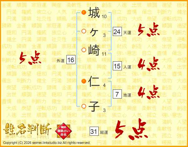 城(10画)ヶ(3画)崎(11画) 仁(4画)子(3画)