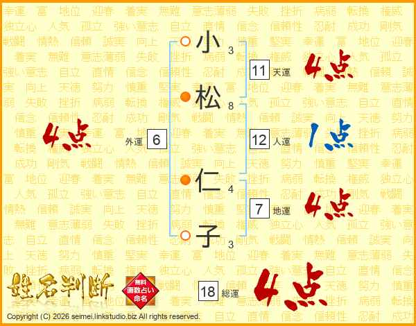 生活面を象徴する運勢です。外部から受ける影響力を表し、結婚運、家庭運や職場、環境への順応性を表します。総運から人運を引いた画数。姓や名が1文字の場合を除く。