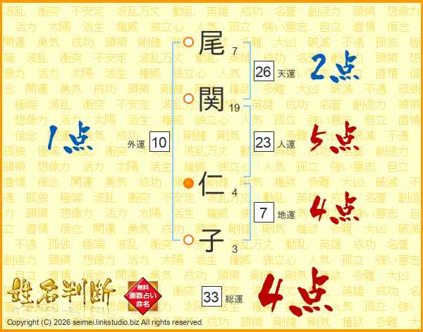 尾(7画)関(19画) 仁(4画)子(3画)