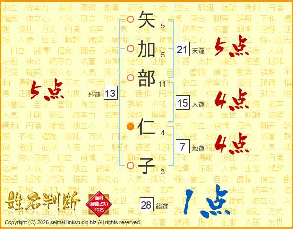 矢(5画)加(5画)部(11画) 仁(4画)子(3画)