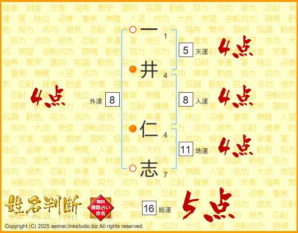 あなたの人生を表す1番重要な運勢です。生涯を通じて影響する総合運となり、主に50歳以降の晩年期に影響を及ぼします。苗字と名前の合計画数。