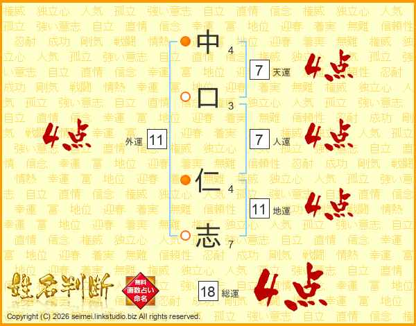 中(4画)口(3画) 仁(4画)志(7画)