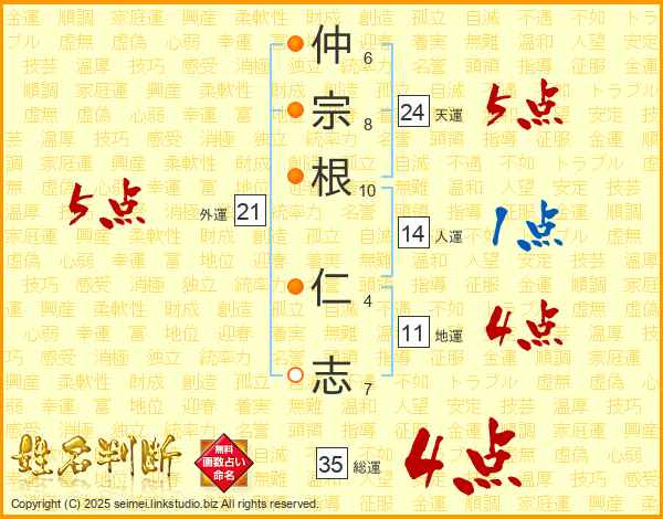 仲(6画)宗(8画)根(10画) 仁(4画)志(7画)