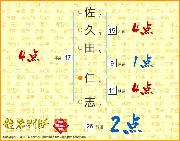 佐(7画)久(3画)田(5画) 仁(4画)志(7画)
