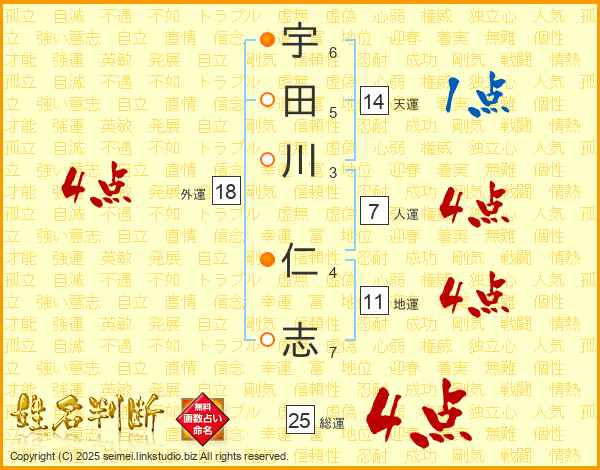 宇(6画)田(5画)川(3画) 仁(4画)志(7画)