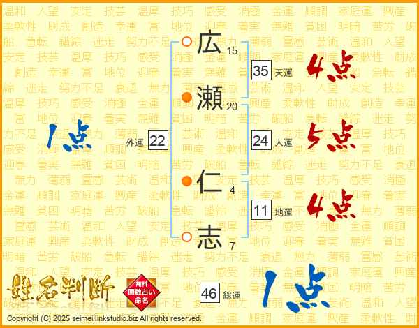 広(15画)瀬(20画) 仁(4画)志(7画)