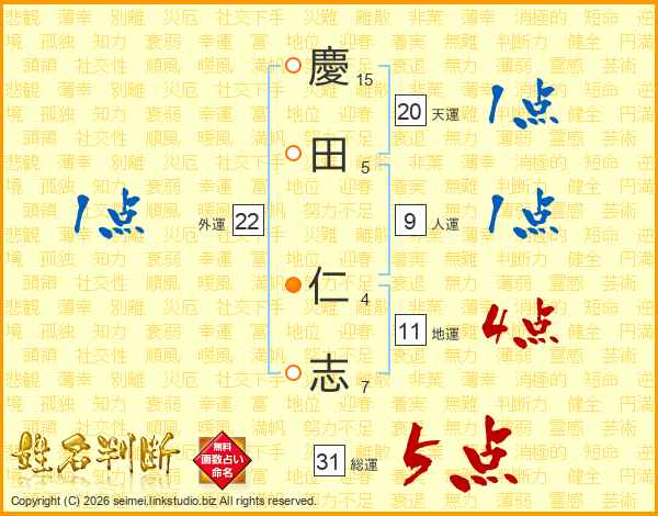 慶(15画)田(5画) 仁(4画)志(7画)