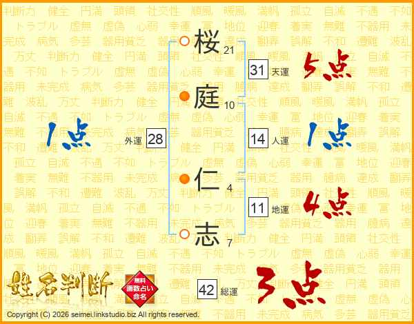 桜(21画)庭(10画) 仁(4画)志(7画)