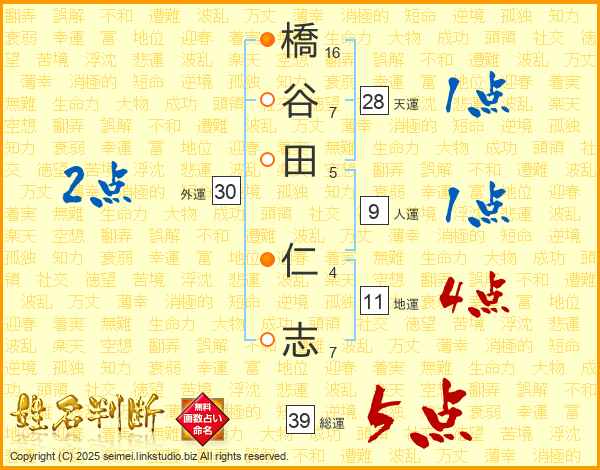 橋(16画)谷(7画)田(5画) 仁(4画)志(7画)